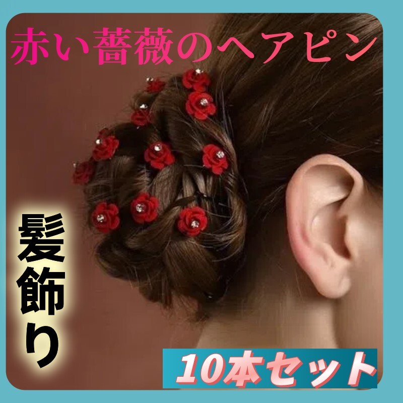 - 赤薔薇ヘアピン☆10本セット(赤)飾り付きU字ピ髪飾り着物成人式振袖袴卒業式 結婚式 七五三ヘアアクセサリー 花飾りウェディング