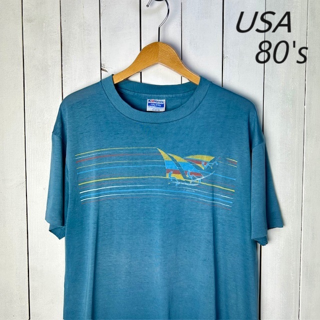 > T●377 USA古着 80s USA製 染み込み サーフィン柄 Tシャツ L~XL 青グレー オールド ヴィンテージ アメリカ Hanes シングルステッチ