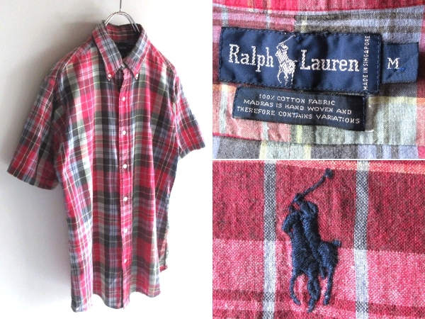 - 希少 90sビンテージ Ralph Lauren ラルフローレン ポロポニーロゴ刺繍 コットン チェック 半袖 BDシャツ M(リサイズ/S程度) ネコポス対応