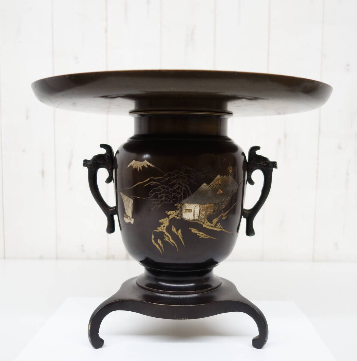 - 時代物 *薄端 うすばた 水盤 御玄猪 花器 花生 *象嵌 山水風景図 富士山 獣双耳 *銅製 古銅 銅器 重量2.7kg *茶道具 茶器 花道具