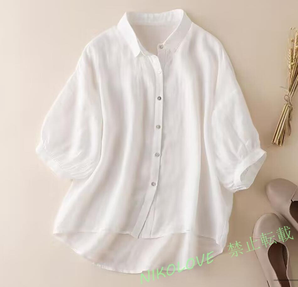 - 新品ナチュラル ゆったり 綿麻 シャツ レディース ブラウス チュニック 五分袖 リネン シャツ 可愛い きれいめ ホワイト LH551