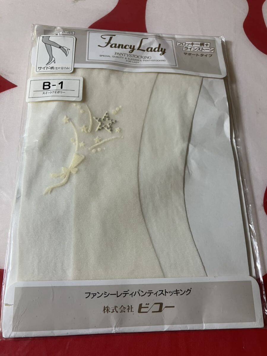 - ビコー ファンシーレディ パンティストッキング フロッキー柄+ラインストーン サイド柄 スイートアイボリー fancy lady panty stocking