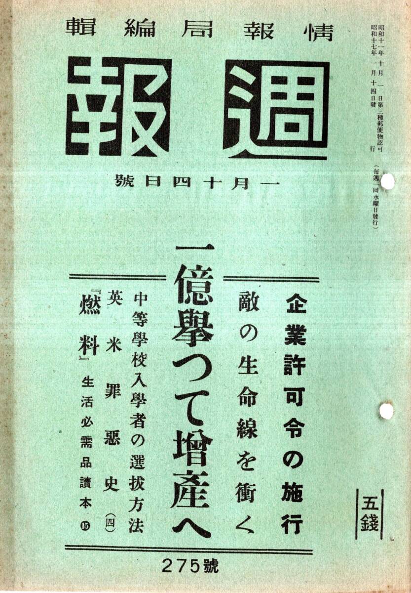 - ※週報第275號 企業許可令施行=商工省・悪辣なハワイ併合等英米罪悪史(4)・大東亞戦争日誌=英領ボルネオブルネイ、マレー翰パル占領等