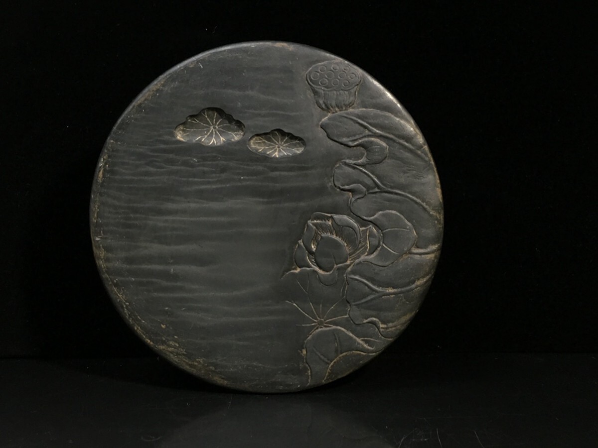 - 清代 眉紋歙石浮彫 荷塘月色文房歙硯 董誥銘【仁】手彫り 文房具 書道具 中国古硯 蔵出