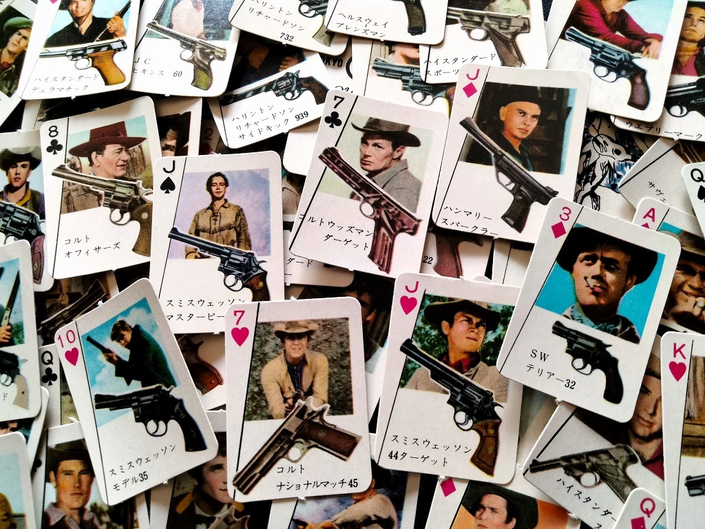 > '60s GUN CARDS マックイーン ユルブリンナー コバーン 当時物 ガン合せ 未使用品 !! ☆ J.ウエイン 西部劇 ピストル トランプ 童友社 ②