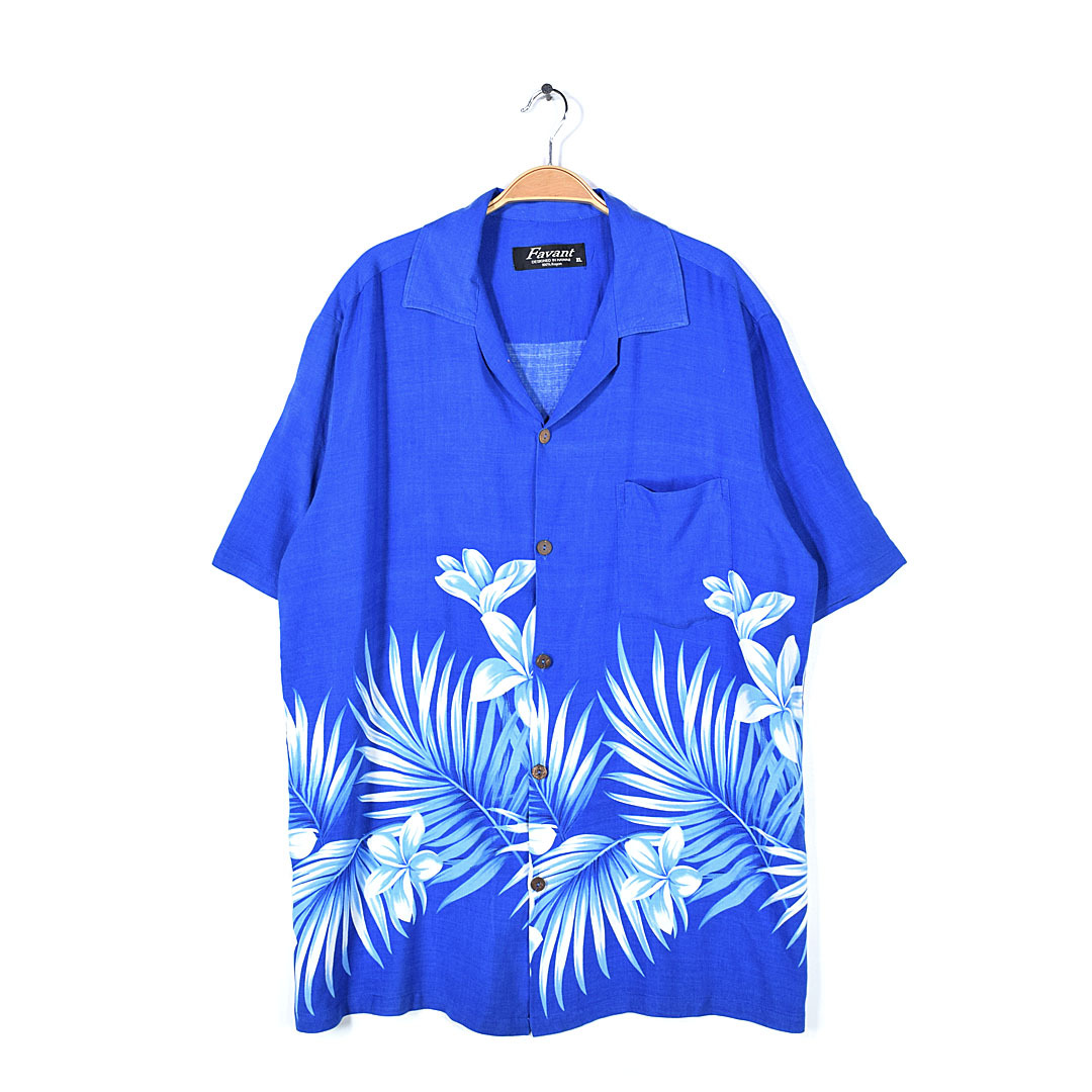 - 【送料無料】Favant アロハシャツ レーヨン ハワイアンシャツ 開襟シャツ ボタニカル柄 青ベース XL 古着 @CD0139