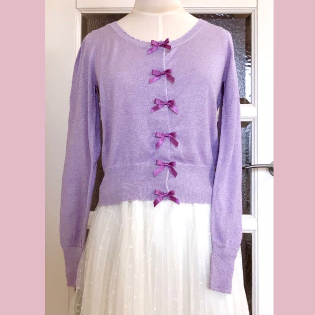 > 【美品】 Emily Temple cute 長袖 カーディガン ラメ リボン パープル 紫 エミリーテンプルキュート ガーリー キラキラ かわいい ドット