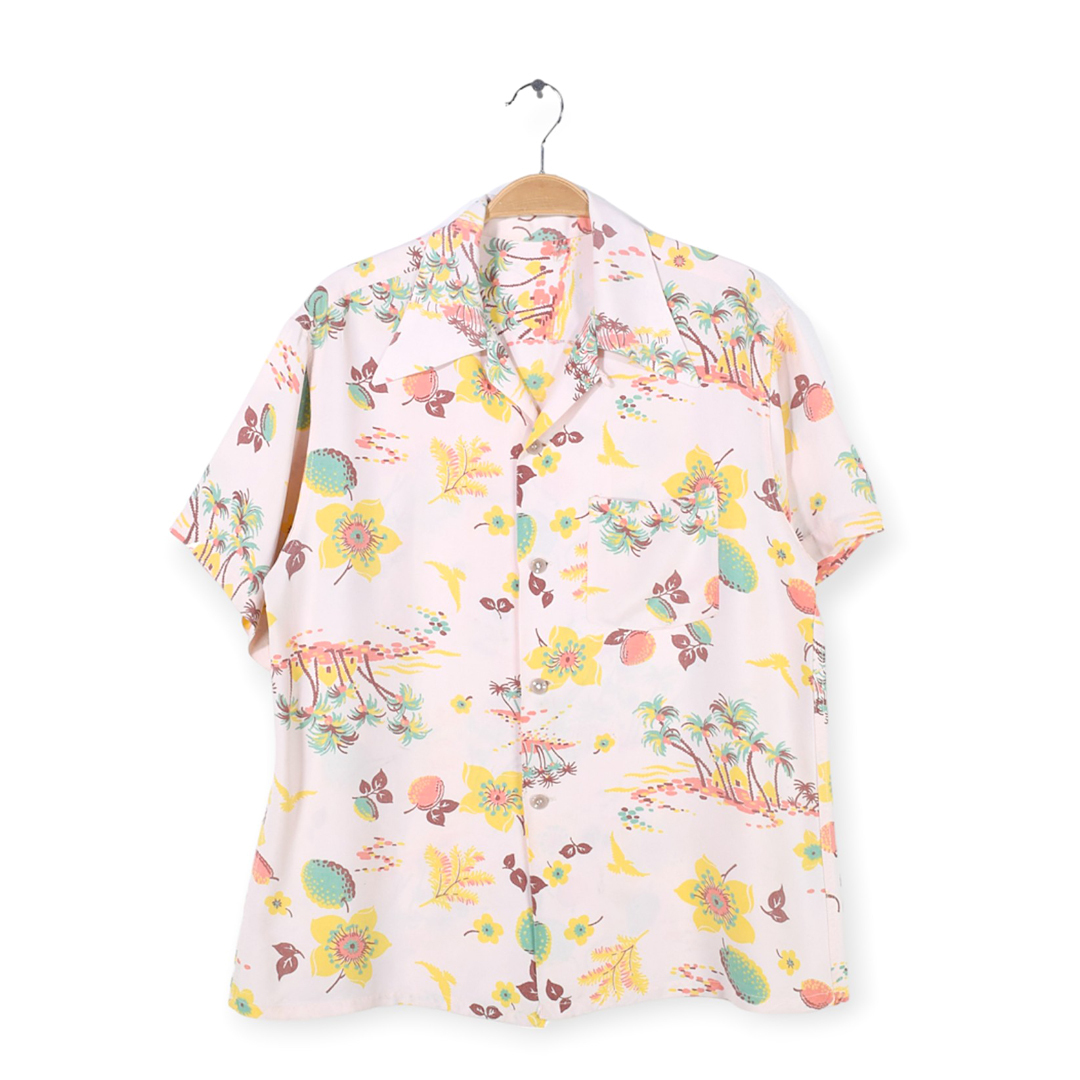 - 【送料無料】50s ハワイ花柄 パームツリー柄 レーヨン 袋襟 ヴィンテージアロハシャツ ハワイアンシャツ サイズM相当 古着 @CCD1325