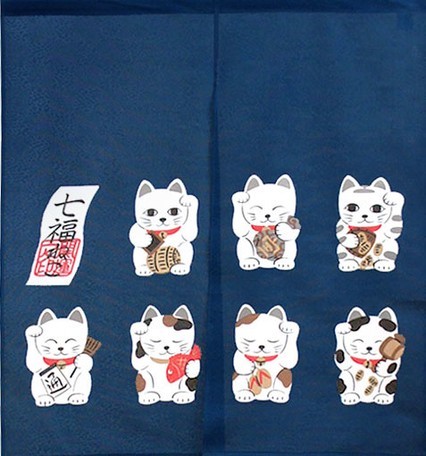 - 暖簾 のれん 85X90cm ポリエステル100%「七福ねこ 紺色 」【日本製】85x90cm