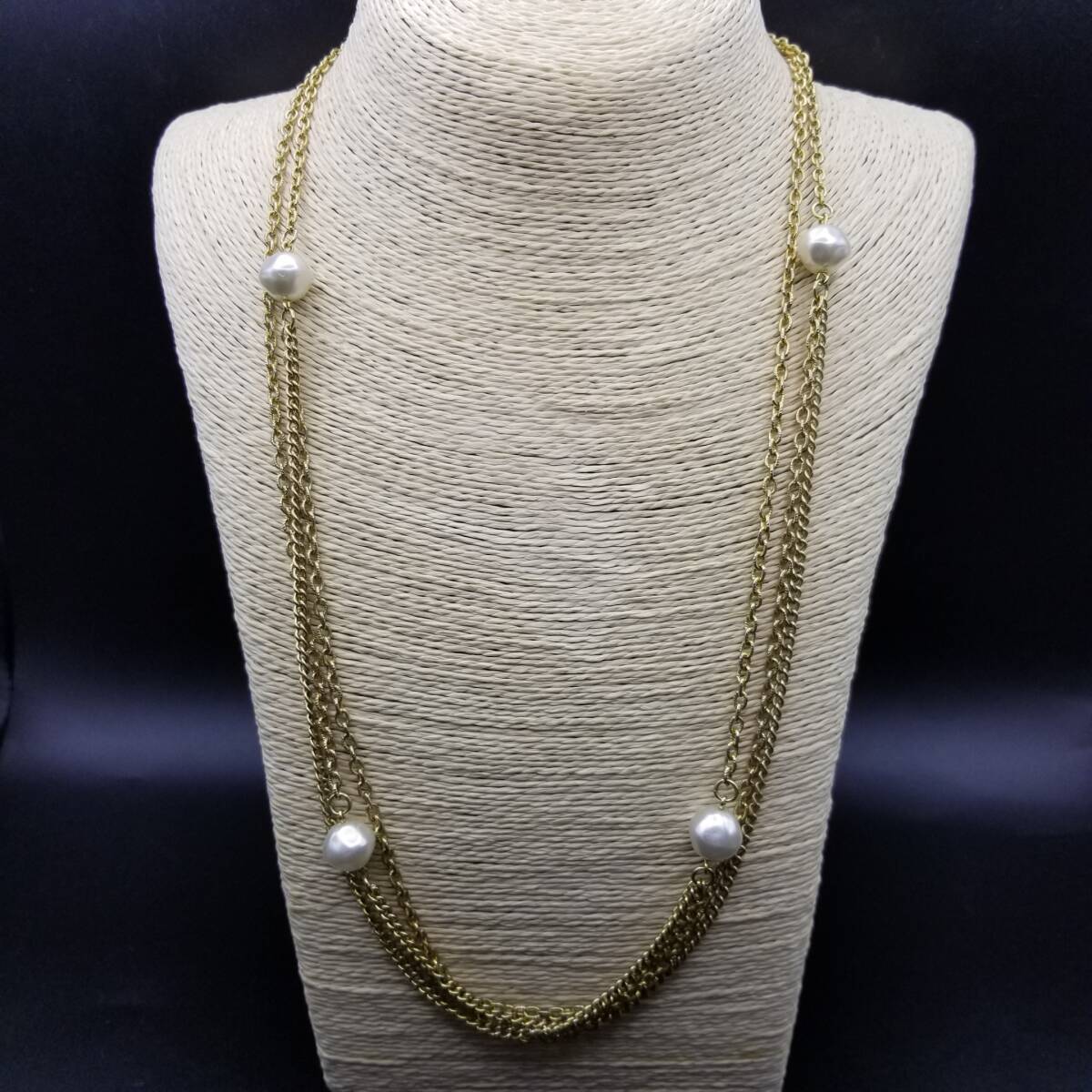 - パールチャーム 2連 ロングチェーン ヴィンテージ ネックレス ペンダント ゴールドトーン ファッションジュエリー Y14-N