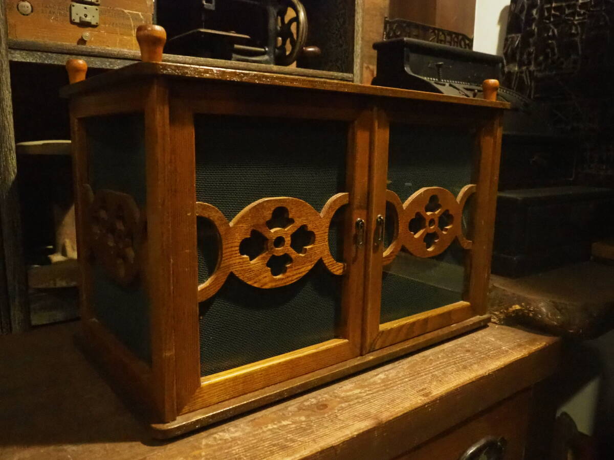 - 【昭和レトロな蝿帳】木製ケース古道具アンティーク文具ウッド書棚インテリア引出し収納裁縫箱インダストリアル真鍮レジ台テーブル