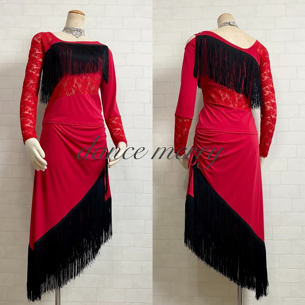 > ★送料無料★【MERRY】 社交ダンス ツーピース セットアップ ラテン 2041 赤 黒 フリンジ レース パーティ サンバ ルンバ 衣装 レース
