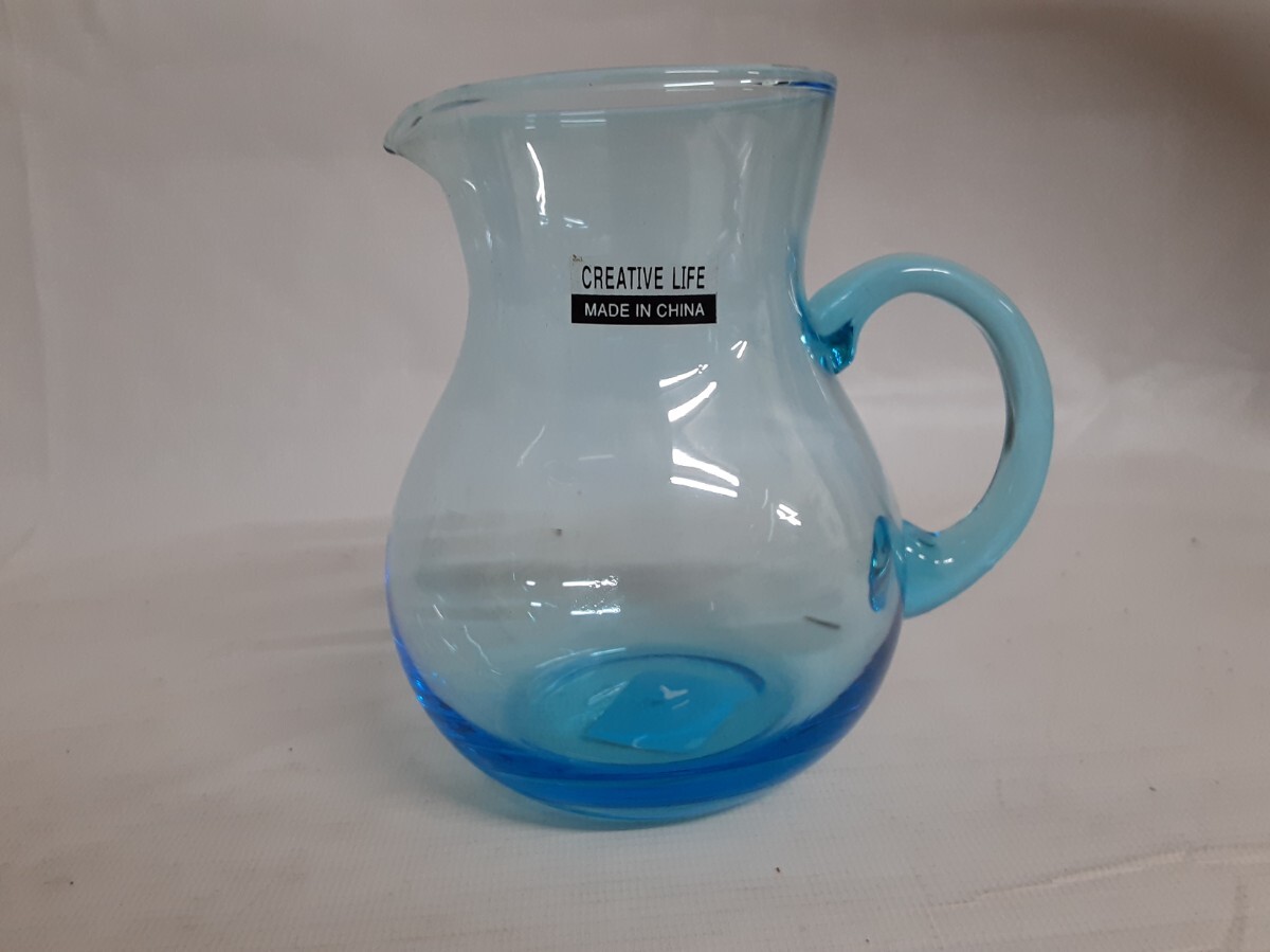 - ☆ ピッチャー☆ガラス加工品☆青☆水色☆花瓶☆タイホウ商事☆工芸ガラス☆