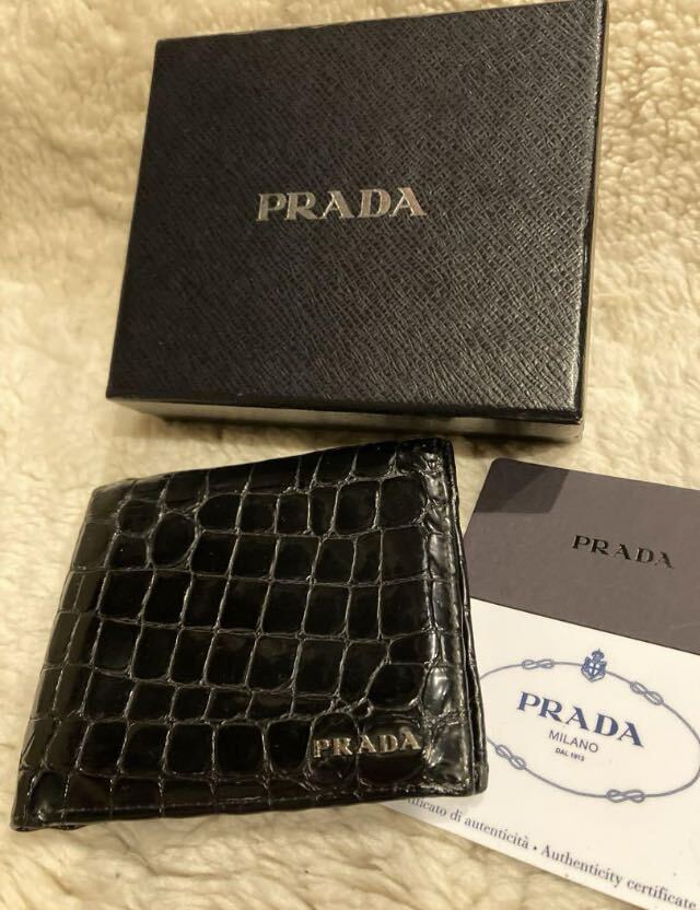 - プラダ 二つ折り財布 クロコ 銀ロゴ 小銭入れ メンズ ブラック PRADA レザー 本革
