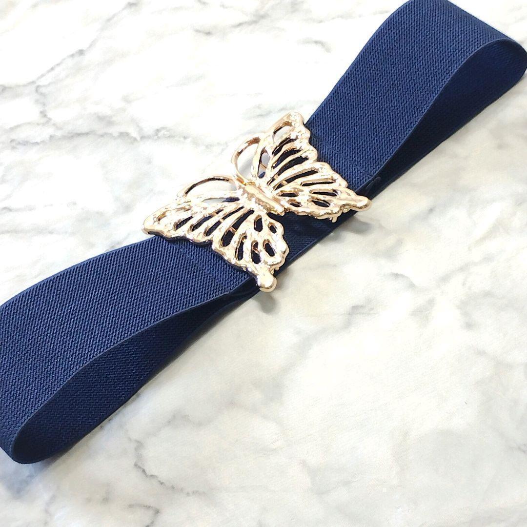 - 【ネイビー色】68cm~99cm蝶々ゴールド バックル 幅広ゴムベルト