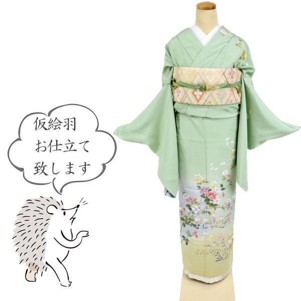 - 【仮絵羽】 訪問着 加賀調 優美な花 淡いグリーン 袷 正絹 着物 お仕立て可 HG3-23
