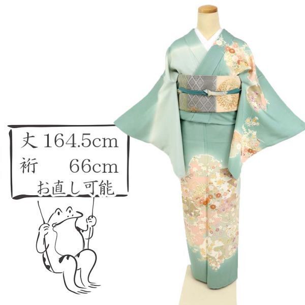 > 【訪問着】 長尺 重ね雪輪に四季の花々 濃淡グリーン 正絹 袷着物 HG12-20