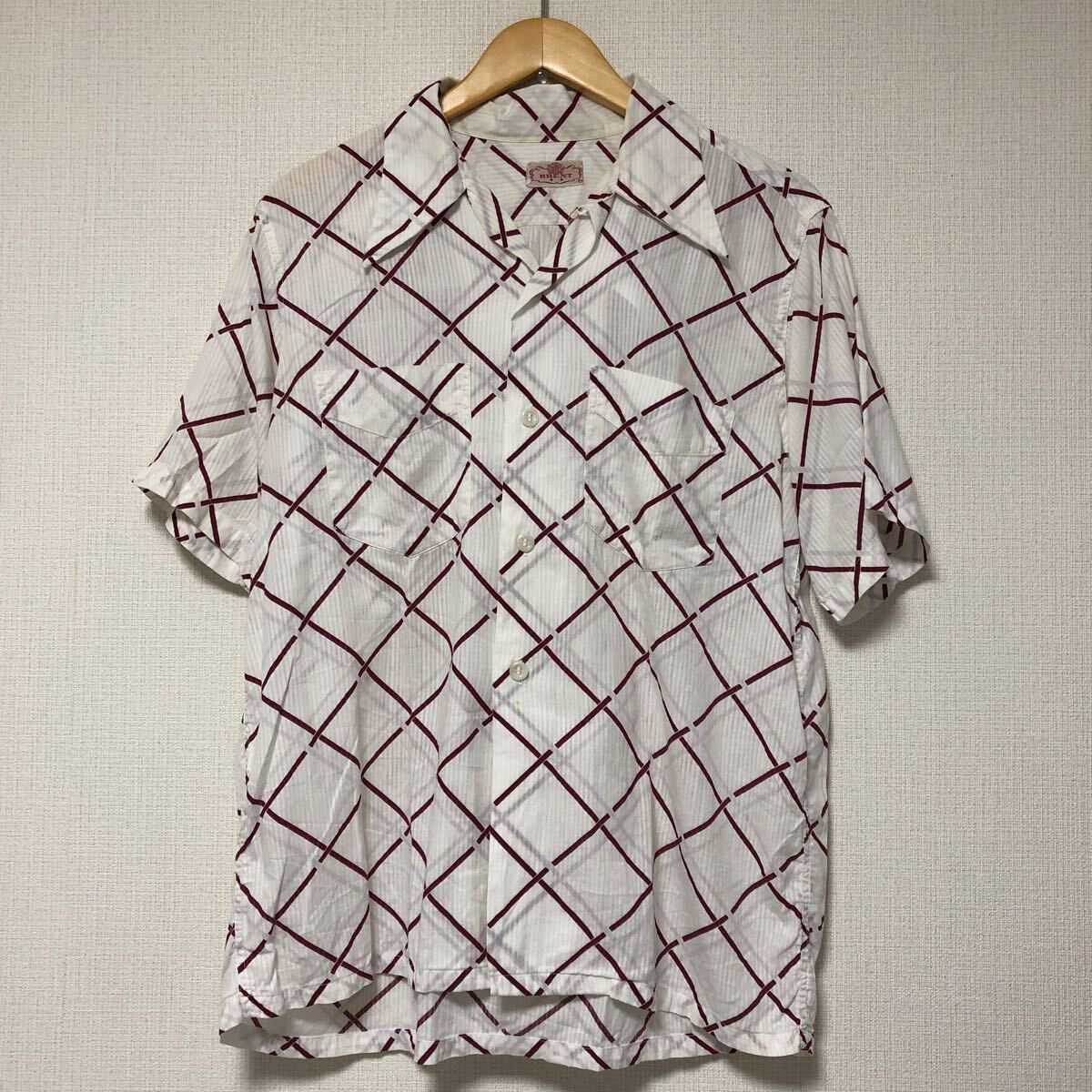 - (k) 40s 40年代 vintage BRENT 開襟シャツ メンズ 半袖 サイズM ビンテージ 総柄 白赤