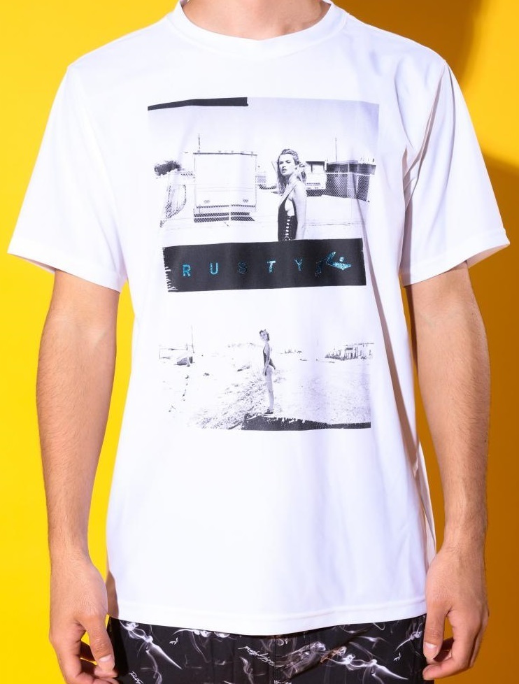 - 訳あり シミあり RUSTY ラスティ 水陸両用 半袖Tシャツフォトイラスト ホワイト Mサイズ BLAND-250