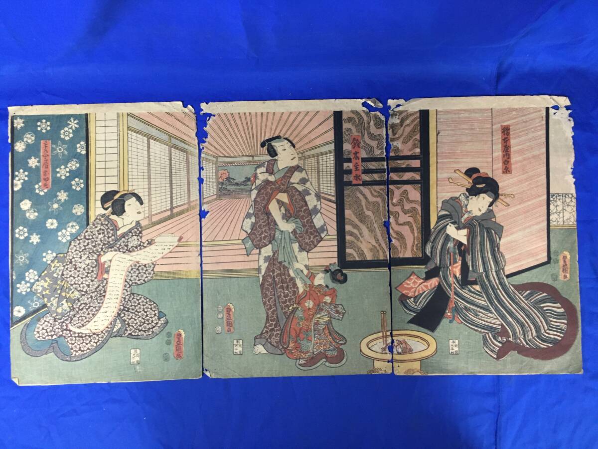 > M185サ△【浮世絵】 豊国三代 鈴木主水 主水女房おやす 橋本屋内白糸 三枚続 江戸期? 真作/錦絵/彩色木版画/役者絵/大判/UKIYOE