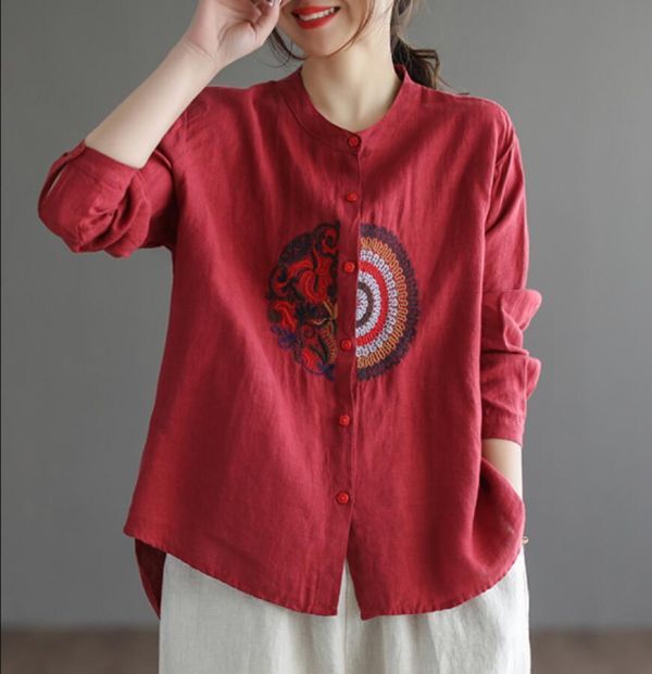 > 新品**チュニック トップス レディース 刺繍入り 綿麻シャツ ブラウス 長袖 大きいサイズ シンプル ゆったり*レッド *