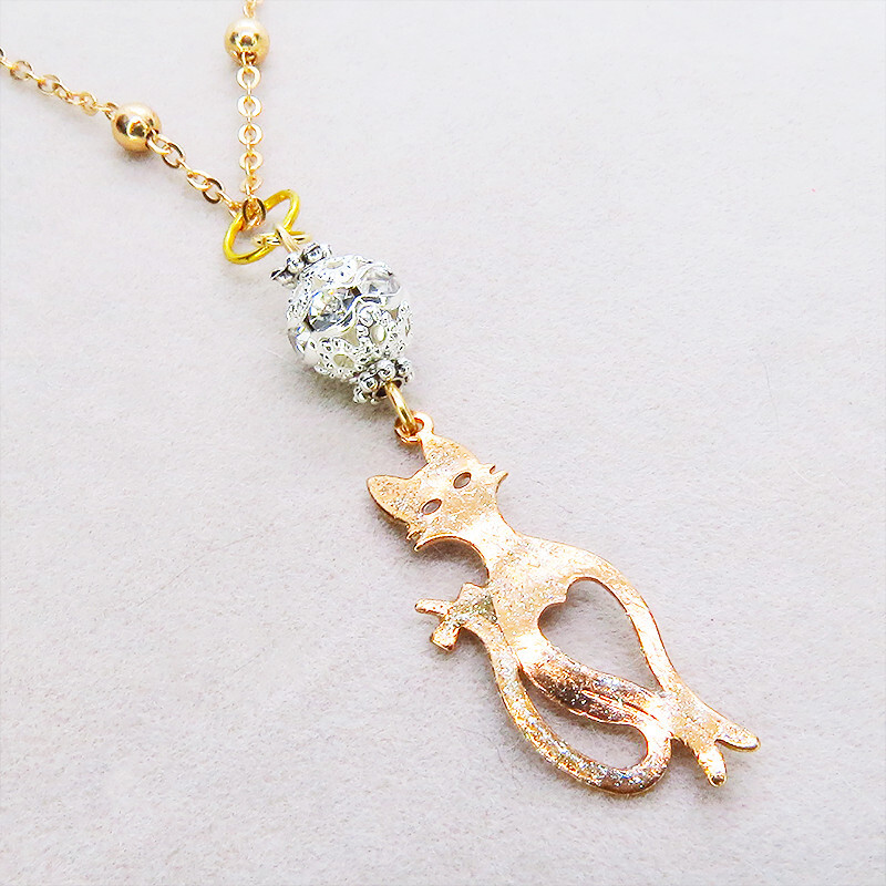 - ラメ入りマットゴールドのスマートな猫シルエットモチーフとメタルビーズ(シルバー)のペンダントネックレス 長さ調整可