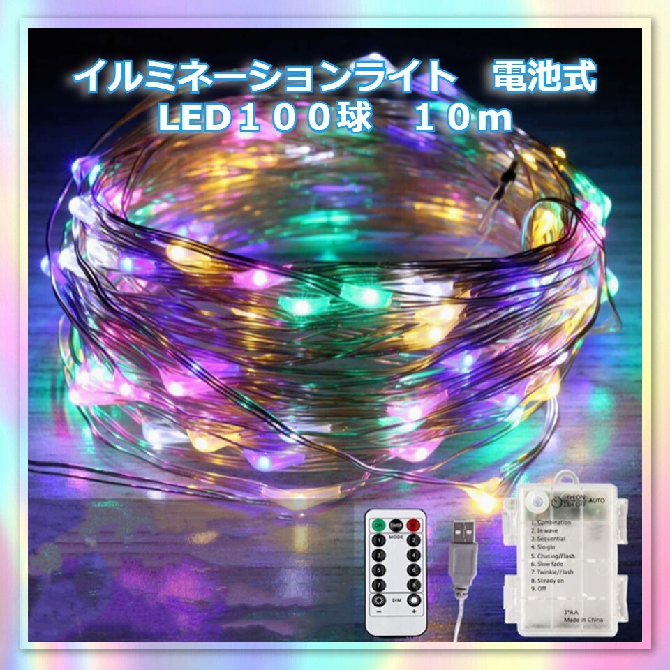 - イルミネーションライト 電池式 リモコン付 100球 10m カラフル