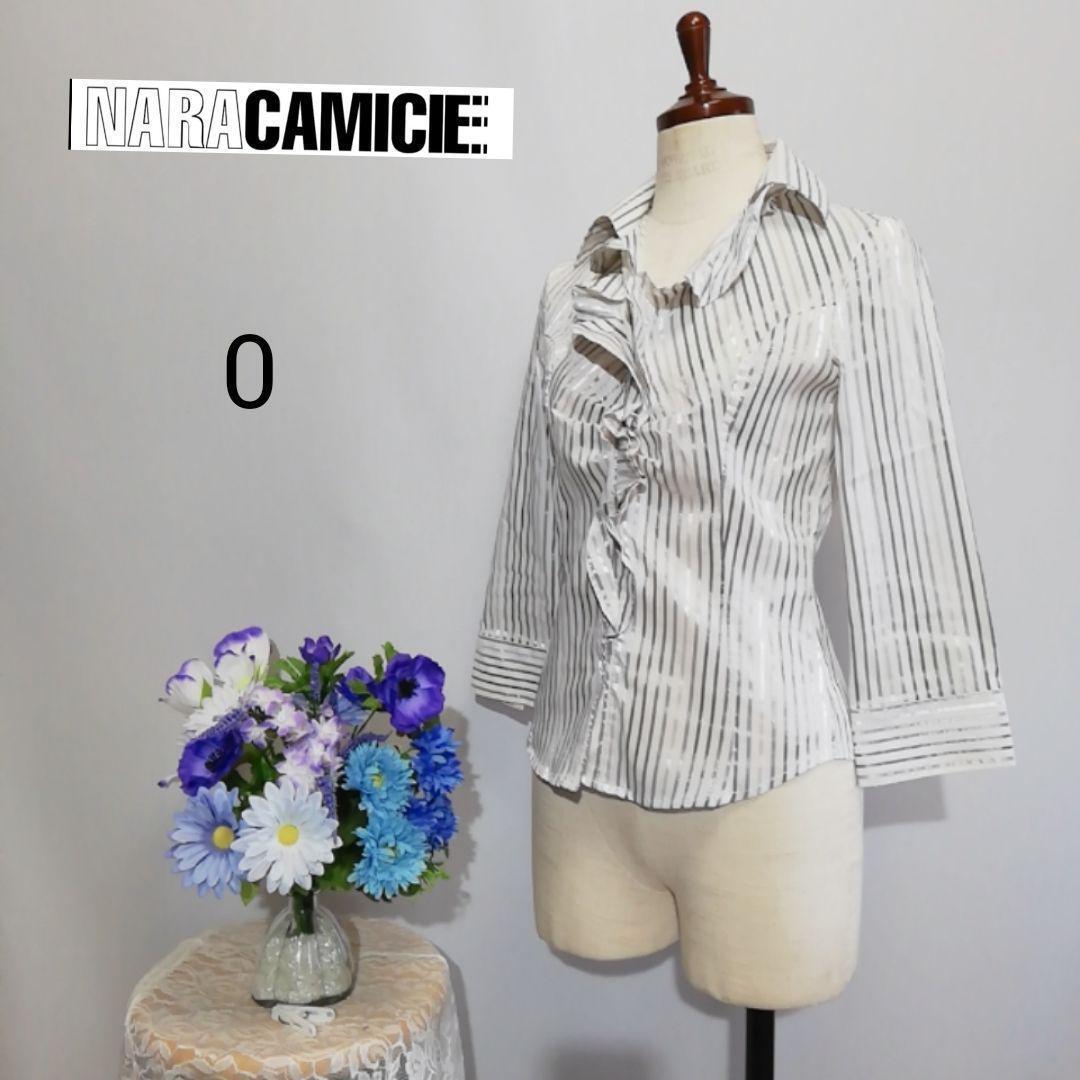 - ナラカミーチェ 極上美品 ストレッチ有 七分袖ブラウス シルバーストライプ柄 S