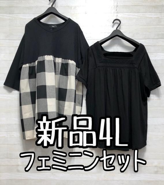 - 新品☆4L♪チェック柄切替&レースデザイン♪フェミニントップス2枚☆f344