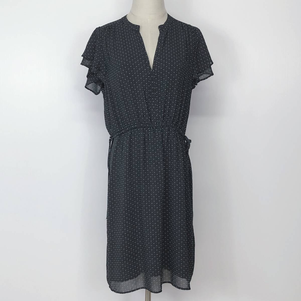 > Y1256 美品 H&M エイチ&エム レディース ワンピース 半袖 サイド腰紐あり 薄手 裏地あり 透け感 ブラック 黒 ホワイト 白 総柄 おしゃれ