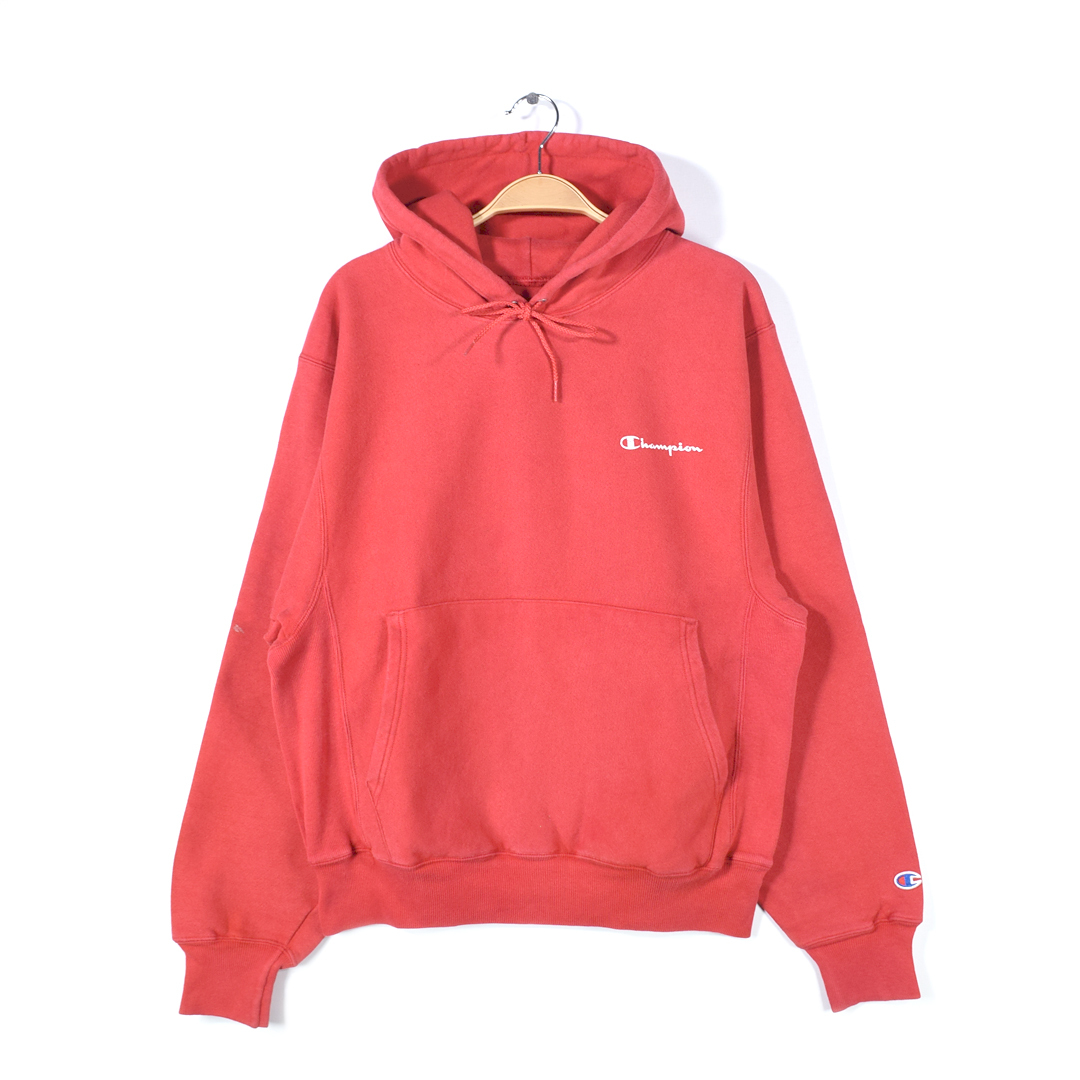 - 【送料無料】チャンピオン スウェットパーカー プレミアムリバースウィーブ ワンポイントロゴ レッド メンズS 古着 @CG0434