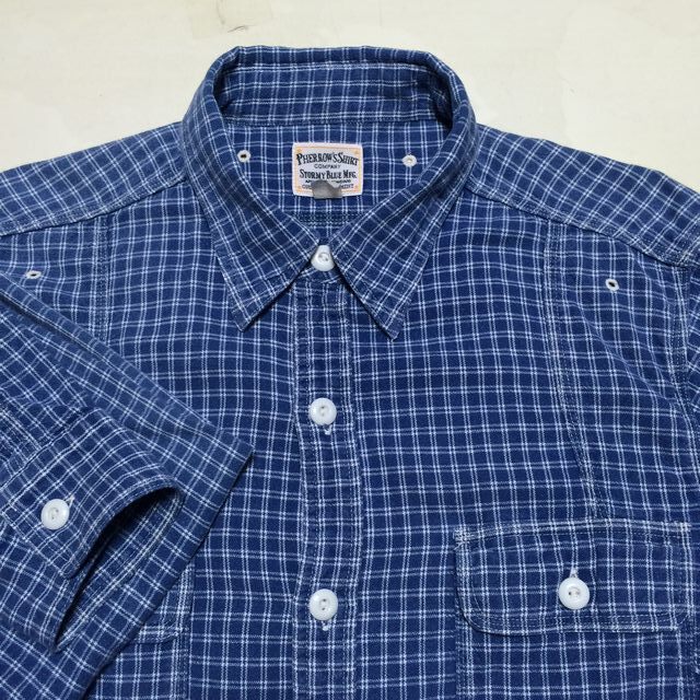 - 美品 PHERROW’S SHIRT STORMY BLUE MFG スタンダードカラーシャツ サイズL15 1/2 ブルー色に白色細線のチェック柄 第1ボタンはダブル仕様