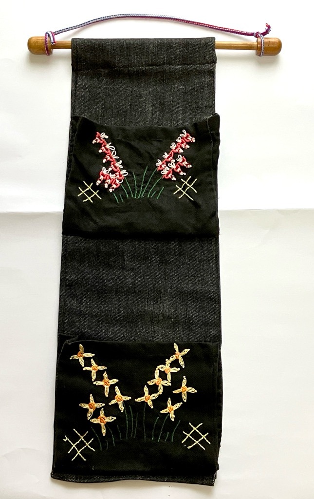 - ハンドメイド◆◆ウォールポケット◆◆刺繍・デニム生地☆棒付き【未使用】壁掛け・収納・小物入れ・レターラック☆リメイク