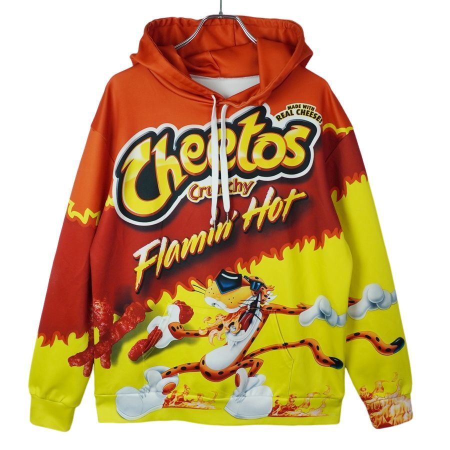 - チートスcheetos flamin hotパーカーフーディ企業系アドバタイジング全面ブリントお菓子スナック炎ファイヤー赤レッド黄色イエロー40228