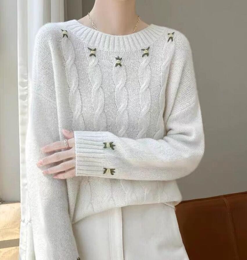 - 秋冬美品*ニット セーター レディース 長袖 きれいめ ニットトップス お花 刺繍入り カシミヤ混 暖かい 通勤 チュニック *ホワイト
