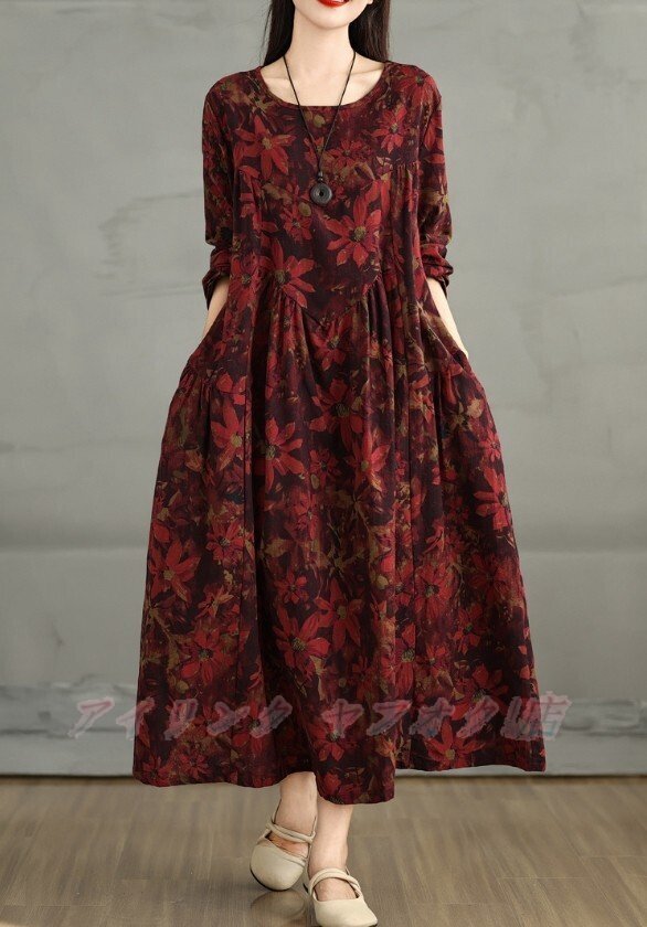 > ☆新品サイズ選択可 ロングワンピース レディース 花柄 Aライン ワンピース ロング丈 長袖 マキシ丈ワンピース レッド