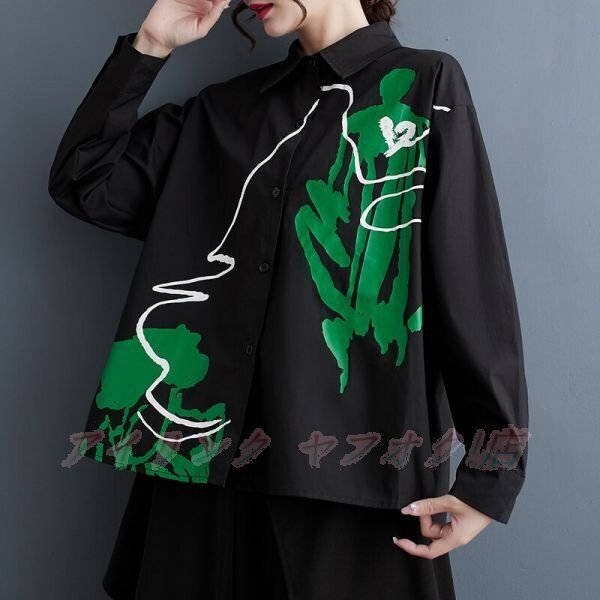 > ☆新品F 上質 不規則 シャツ カジュアル ゆったり プリント柄 チュニック 大きいサイズ 長袖 ブラウスシャツ ブラック