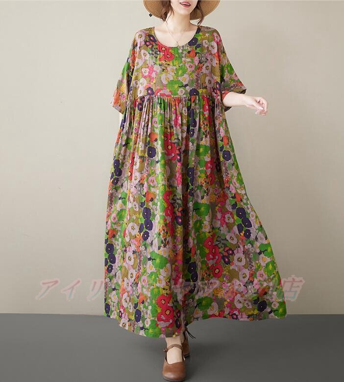 > ☆新品ロングワンピース 花柄 綿麻 半袖 ポケット付き ワンピース プリント 総柄 ゆったり 体型カバー フレアワンピース 13