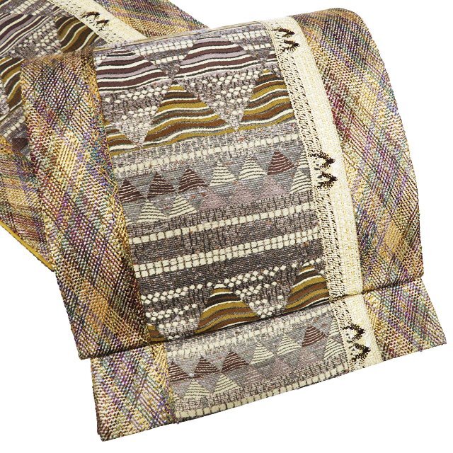 > 袋帯 中古 リサイクル 正絹 フォーマル 仕立て上がり 六通 組織 組帯 箔糸 マルチカラー 茶系色 多色 金 きもの北條 A1106-15