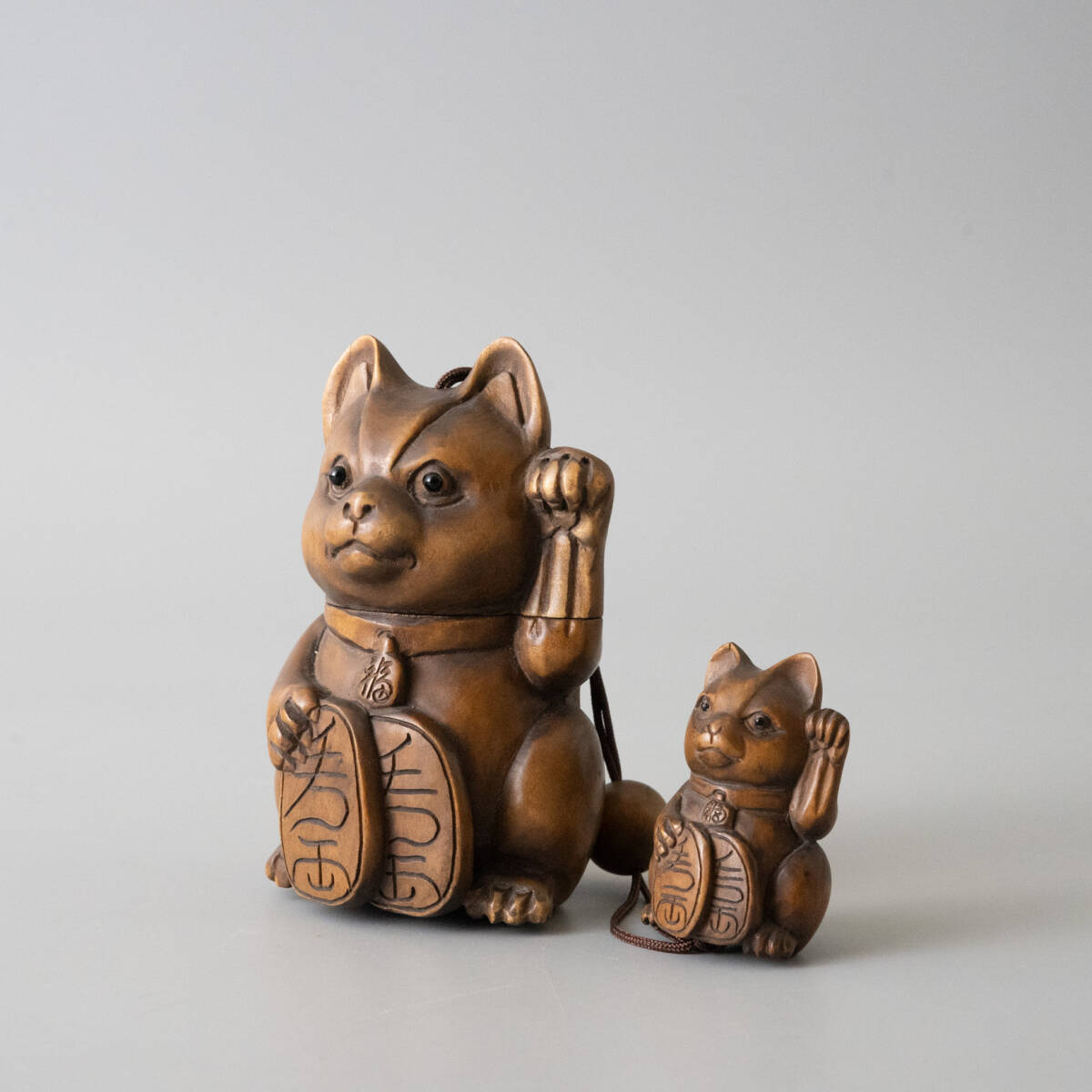 - 招き猫 たばこ入れ 柘植 木製彫刻 根付 置物 オブジェ 飾り 古道具 民芸 骨董 アンティーク 莨入れ 小物入れ