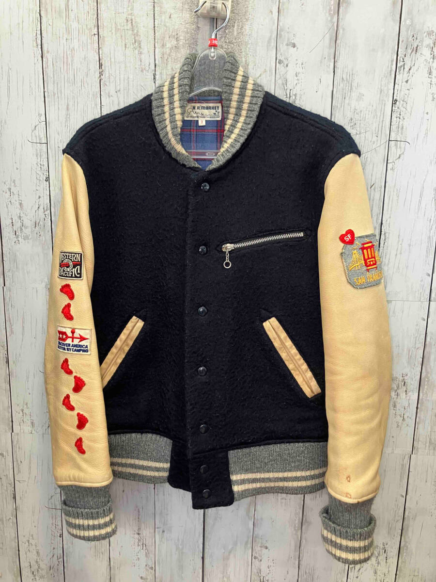 > HOLLYWOOD RANCH MARKET ハリウッドランチマーケット レザー切り替え 牛革 日本製 スタジャン メンズアウター 汚れ有り ネイビー