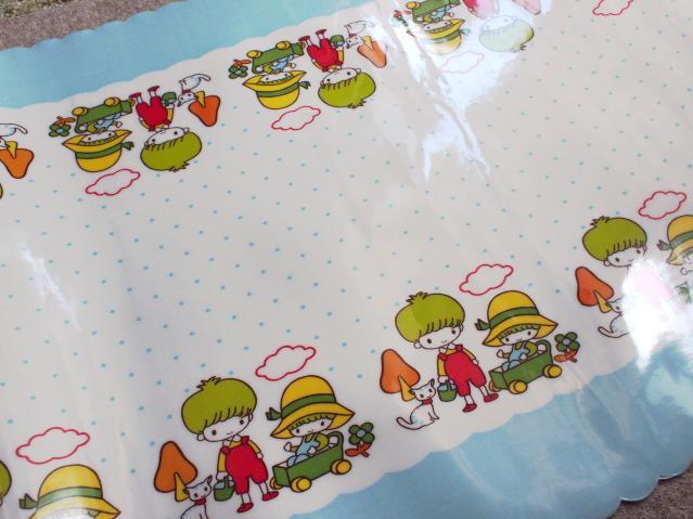 > レトロキッチン日用品雑貨*ラスト2・ほのぼのした子供とネコちゃん水色水玉ビニール・40×125☆ランチョンマットクロス