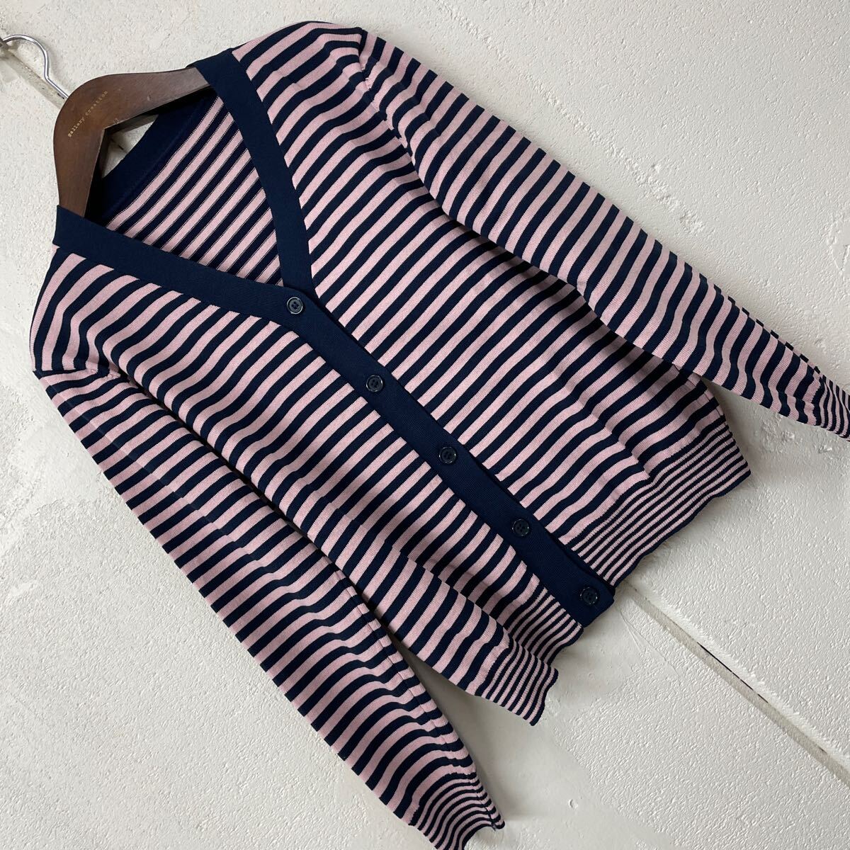 - 訳ありサラサラニット前ボタンカーディガン ボーダーピンクネイビー