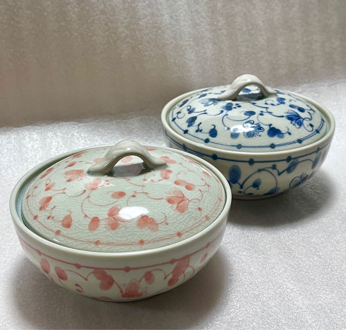 - 未使用 新品 美濃焼 幸泉窯 蓋付き 煮物椀 藍唐草 花唐草 組蓋物 2個 セット ペア 蓋付 赤青 可愛い お洒落 荷物 汁物 和食器 花柄
