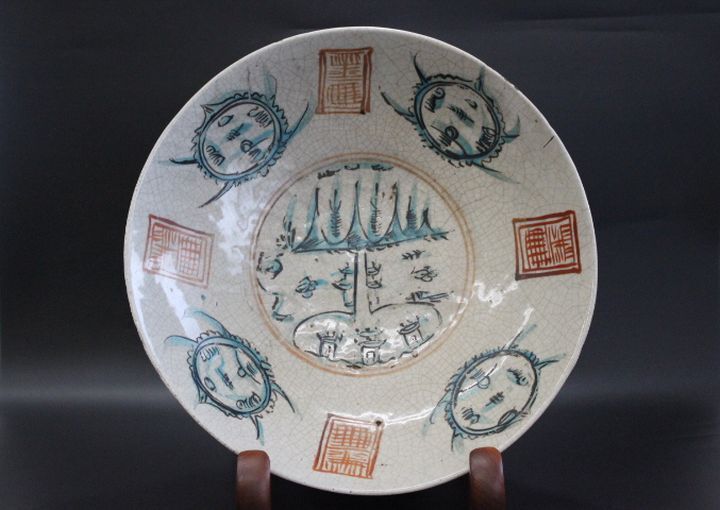 - f300 技工名品 古渡 時代物 明代 州窯 五彩山水文 平鉢 呉須赤絵 鉢 横37.2cm 唐物 古玩 中国美術 古美術品