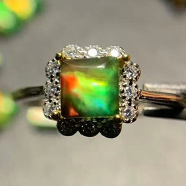 - (証明書付き)高級天然アンモライトリング、925スターリングシルバー、5x5mm、サイズ調節可能、最初の入札者様は開始価格で購入可能