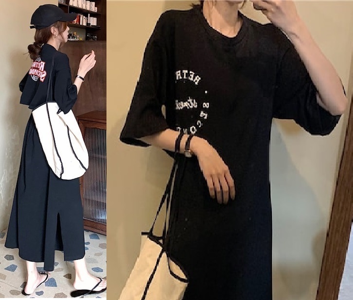 - 新品【お洒落Style】シンプル&カジュアル♪スリット入*英字ロゴ入*ロングワンピース*ブラック DJ863