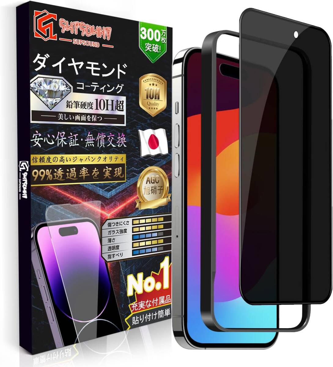 - SUPSOUND【1枚入り】iPhone 15 Pro 覗き見防止強化ガラスフィルム 硬度10H強化ガラス 飛散【貼り付け簡単 ガイド枠付き】 (6.1インチ対応)