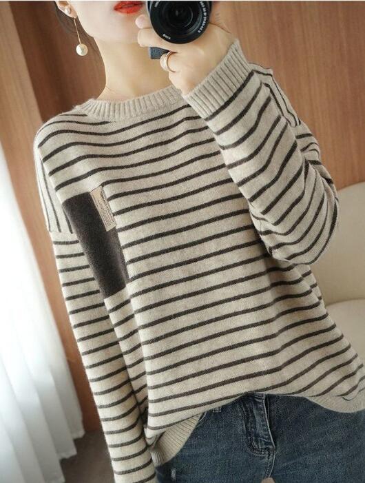 - 秋新品*ニット セーター レディース 長袖 ボーダー柄 ニット トップス 着痩せ おしゃれ かわいい セーター オフィス 通勤 女性* ベージュ
