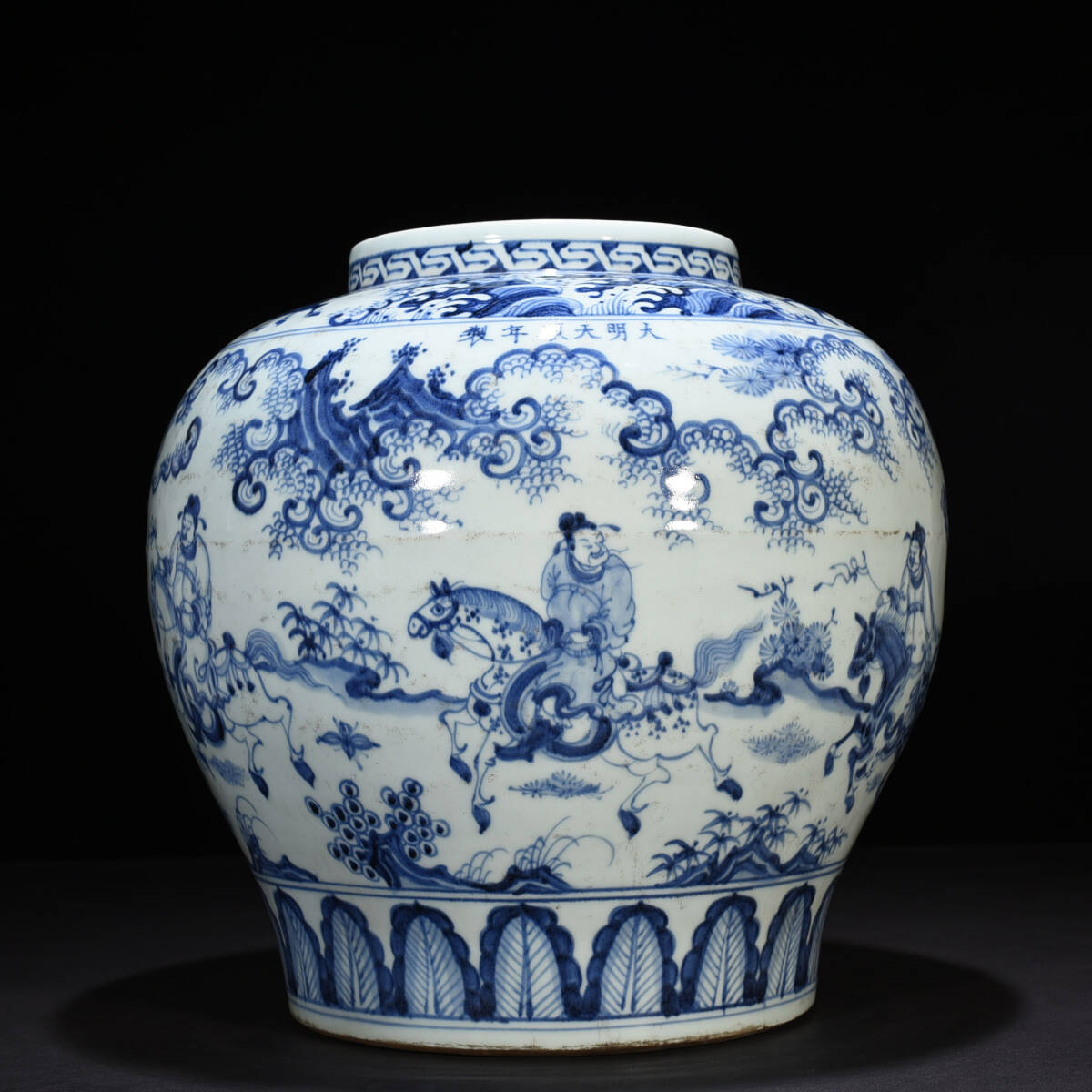 > ◆旧家蔵出◆古美術 中国古玩 大明天順年製款 青花 携琴訪友 人物故事図大罐 古賞物 骨董 時代物 A33